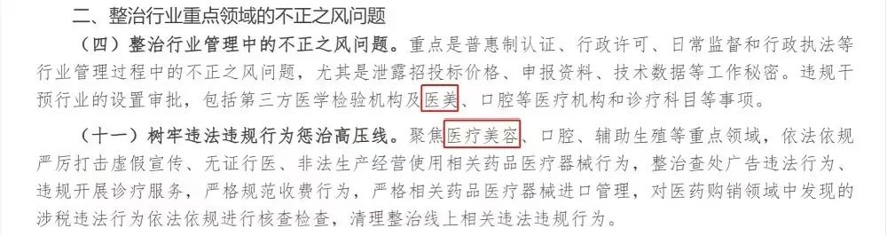 医美也是本轮反腐的重点之一。《工作要点》在第(四)点“整治行业管理中的不正之风问题”和第(十一)点“树牢违法违规行为惩治高压线”中均提到了医美,指出要依法依规严厉打击虚假宣传、无证行医、非法生产经营使用相关药品医疗器械行为,整治查处广告违法行为、违规开展诊疗服务,严格规范收费行为。